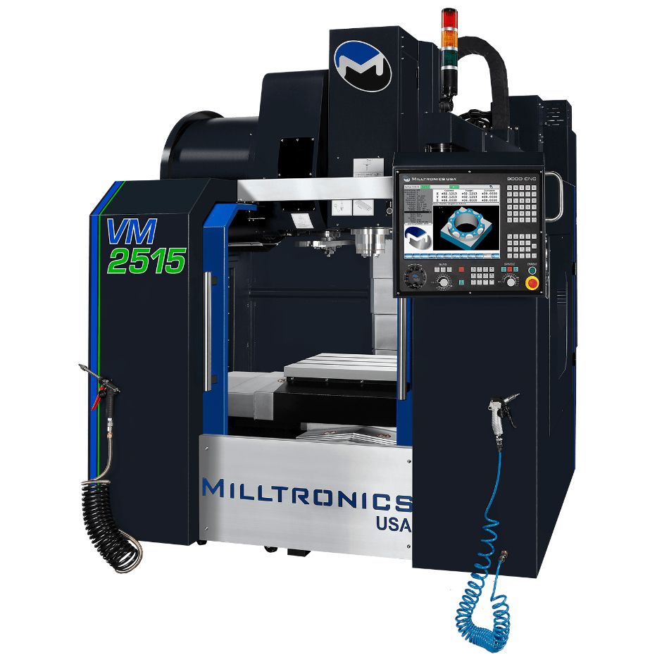The Milltronics VM Series vertical machining centers offer a great combination of features and performance at an attractive price. The VM Series machines are belt-driven and include standard features such as full enclosures, swing-arm tool changers, 10,000 RPM BIG-PLUS® dual contact spindles, the 9000 Series control, and more.